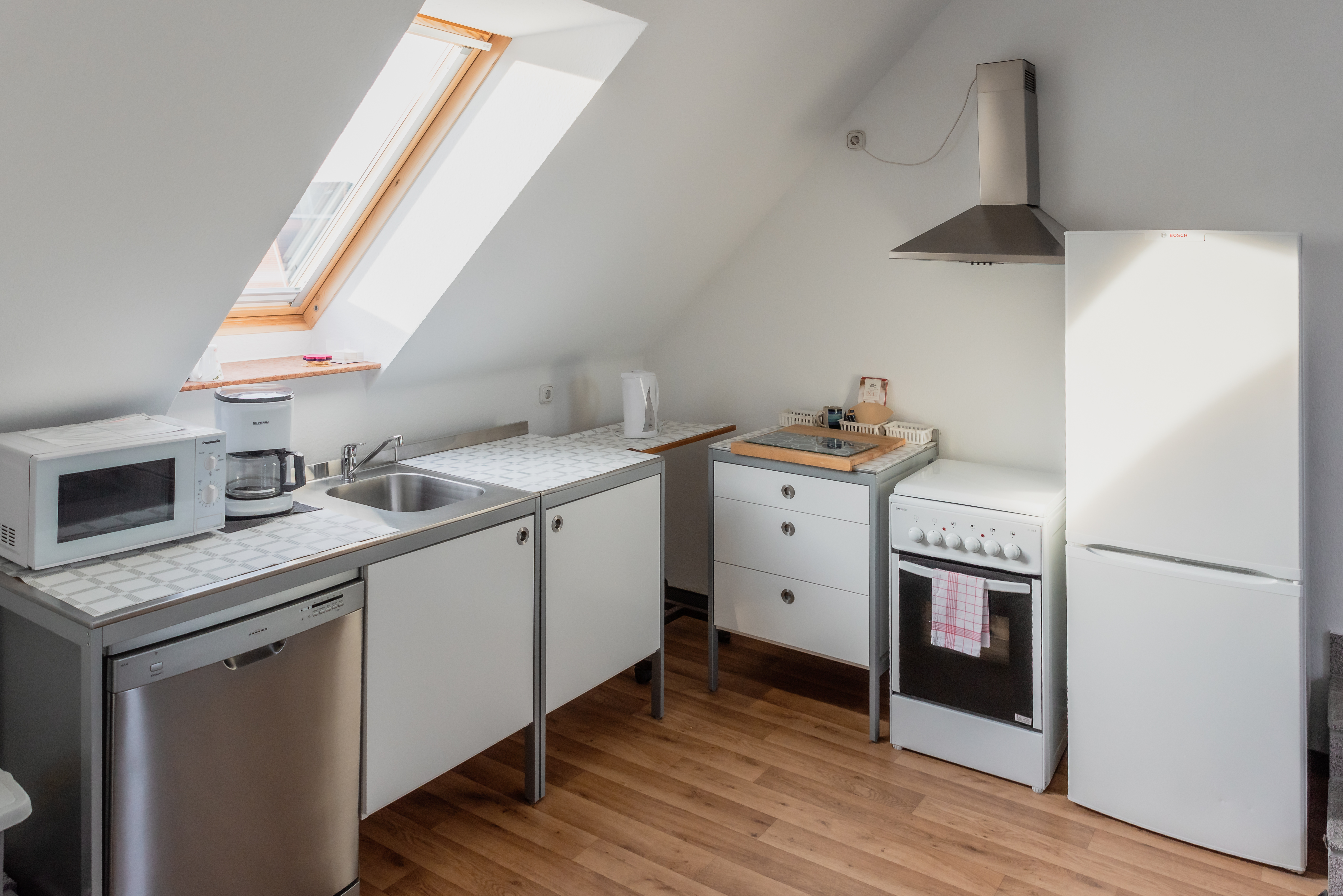 In der Küche sind Küchenschränke mit gepflegtem Inventar, Elektro-Herd mit Backofen, Kühlschrank, Mikrowelle, Toaster, Kaffeemaschine,Wasser-Eierkocher und Geschirrhandtuch vorhanden. Ebenso auch ein Bodenwischer und ein Staubsauger.